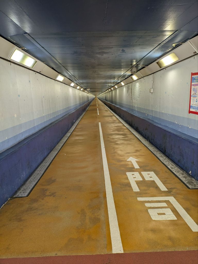 I got to the tunnel at 6.15, and paid the ¥20 fee for taking a bike. The tunnel runs for 780m under the straits and the elevator takes a surprisingly long time to descend. When I got to the bottom the woman who had taken the elevator before me was a long way ahead. In fact, the tunnel was busy with men in tracksuits and older women power walking along it as if it was a running track. Two old ladies in face masks bid me good morning. The sounds of the cars and the trucks crossing the road bridge high above our heads filtered down to us, and the sound of running water came out of the vents.