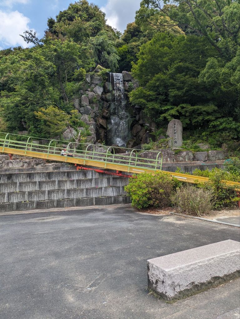 I surfaced several minutes later in Kyushu. The sun was already hot, but a cooling wind blew in the shade. There was nothing on the road. Something leaped from the bushes and I made an involuntary, “Wah!” sound. In a tiny village on a perfectly straight and empty road a mother walking her child to elementary school pressed the pedestrian light. I passed a waterfall where the town had installed a slide which ran in rollers. A father, a mother and a child came down it, the mother whimpering in pain at the rollers. I laughed and commiserated with her, then later I thought, “You don’t even know where butt pain starts lady.”