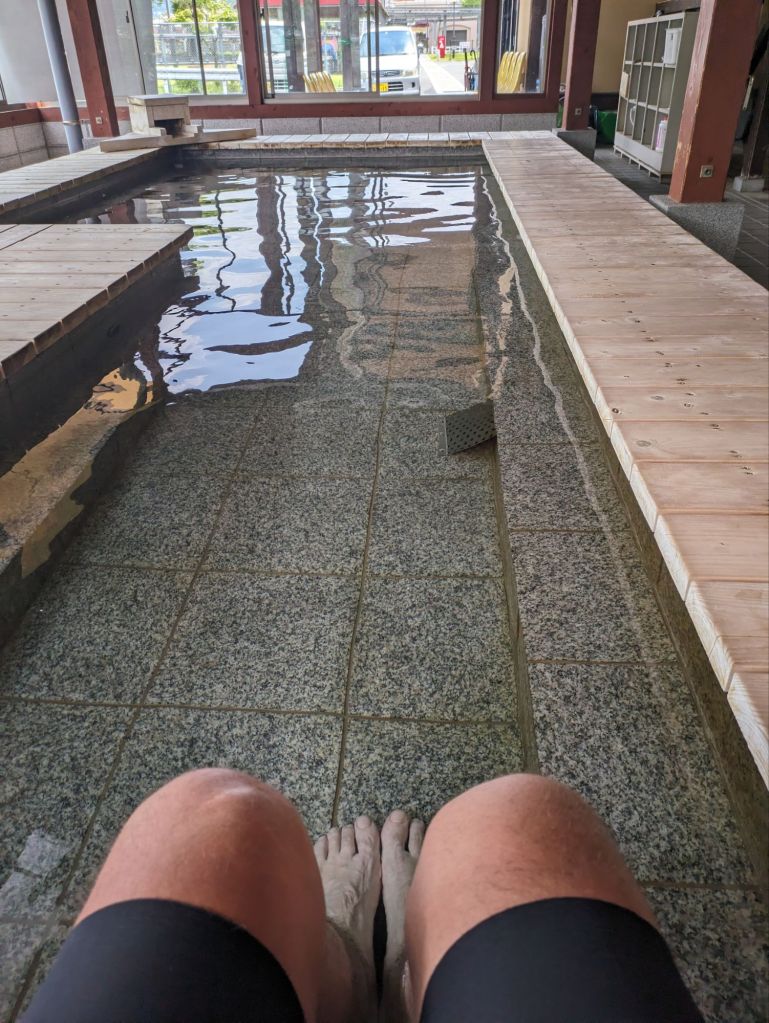 I came to a foot spa. This is a natural water pool where you pay ¥100 and sit on a wooden bench on the side of the pool and soak your feet. A very friendly lady beckoned me in and showed me how to get a ticket from the machine. I handed this ticket to the man at the counter, who was supervised by another man. Then I soaked my hot feet for twenty minutes.