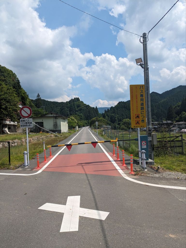 I cycled to Hikosan station which, although run by Japan Railways, is actually a bus terminal made to look like a station. The road and the tunnel are owned by JR and there were railway gates blocking the road and strict signs telling cyclists and motorcyclists to sling their hooks. I pedalled on to the first climb.